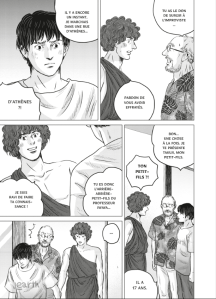 Mari Yamazaki est passée maître dans l’art d’utiliser des artifices loufoques comme le voyage dans le temps pour aborder des sujets sérieux. Si elle n’explique jamais la mécanique temporelle qui intervient dans Thermae Romae (sinon quelques propriétés magiques des eaux thermales?), dans ce cas-ci il s’agit de la foudre qui frappe à répétition le pauvre Démétrios, ce qui (faute de flux capacitor) ne peut être attribué qu’au désir de Zeus d’aider le héros dans sa quête identitaire en suivant la plus pure tradition des récits épiques. Certains ont reproché à Yamazaki d’utiliser deux fois la même technique pour mouvoir son récit mais quand l’on détient une formule gagnant pourquoi la changer? Mais peu importe l’artifice; ce que Yamazaki veut accomplir c’est de comparer les cultures de l’antiquité (romaine dans le cas de Thermae Romae et grecque pour Olympia Kyklos) avec celle du Japon. Ayant vécu tant au Japon qu’en Italie, Yamazaki avait remarqué plusieurs points de similitude entre ces cultures et a eut l’idée de s’en servir comme d’un miroir où le lecteur (à priori Japonais) peut se reconnaitre et se questionner.
