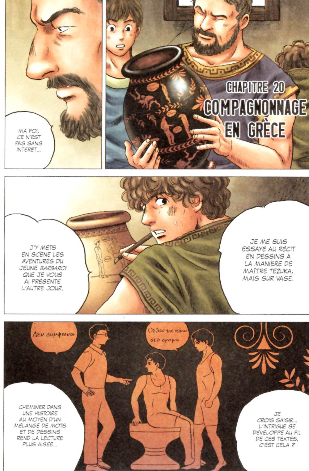 “Démétrios a sauvé son village des appétits conquérants de la cité voisine au cours d’une épreuve sportive qu’il a ramenée du XXe siècle. Il est bien décidé à retrouver ses vases et ses pinceaux, mais le patriarche ne l’entend pas de cette oreille : il en est sûr, Démétrios a l’étoffe d’un champion, il est l’athlète qui apportera gloire et prospérité à sa communauté ! Aux abois, Démétrios est à nouveau transporté jusqu’au Japon des olympiades de 1964. Après le sport, cette fois, c’est sa conception du dessin que notre jeune peintre va voir bouleversée, en devenant l’assistant du dieu du manga, Osamu Tezuka en personne !”