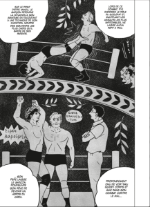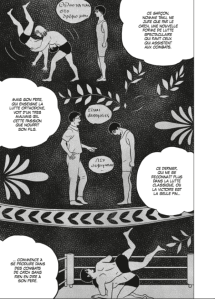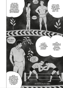 Mari Yamazaki n’a as son pareil pour utiliser des artifices loufoques comme le voyage dans le temps pour nous faire réfléchir sur des sujets sérieux et comparer les cultures de l’antiquité et du Japon — cette fois grâce à la foudre de Zeus! Elle nous raconte les mésaventures de Démétrios, un jeune homme athlétique mais qui n’est pas du tout intéressé aux sports car il a l’âme d’un artiste (il peint des vases). Toutefois les circonstances le forcent toujours à faire de la compétition sportive. Pour l’édifier, les dieux l’envoient à tout bout de champs (et sans avertissement) dans le Japon moderne pour découvrir des aspects différents des disciplines olympiques. Dans ce volume, il découvre le catch (lutte professionnelle) et le compare à la lutte classique. Exceptionnellement, cette fois c’est le jeune Takuji qui est transporté à Athènes pour prendre quelques leçons auprès de l’entraîneur Platon qui allie discipline sportive et philosophie pour élever la conscience: “Toute pensée fausse qui traverse votre esprit entrave les mouvements de votre corps” !